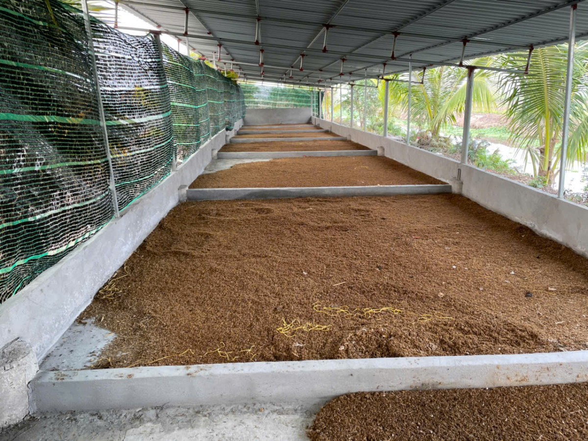 Điểm đặc biệt trong mô hình của Vũ Văn Quân chính là chuỗi sinh thái khép kín. Để chủ động nguồn thức ăn sạch, giàu dinh dưỡng cho cả cá Koi và gà chọi, anh đã đầu tư nuôi sâu canxi trên diện tích 1.000m2. Sâu canxi là nguồn đạm và canxi dồi dào, thân thiện với môi trường, giúp giảm chi phí thức ăn công nghiệp, đồng thời tăng cường sức đề kháng cho vật nuôi. Việc kết hợp nuôi gà chọi, cá Koi và sâu canxi đã tạo nên một chu trình tuần hoàn, tận dụng tối đa nguồn lực và chất thải, mang lại hiệu quả kinh tế vượt trội và thân thiện với môi trường.