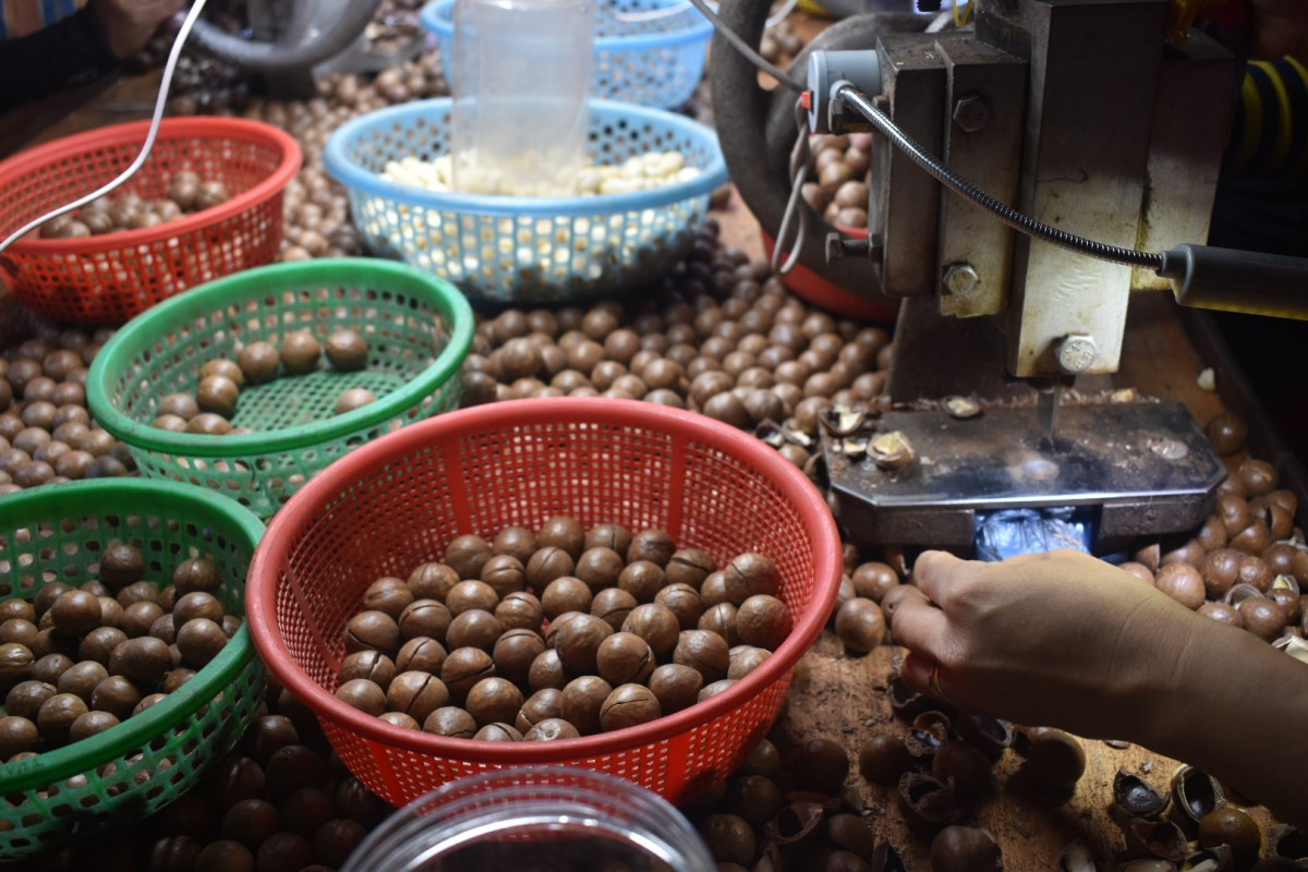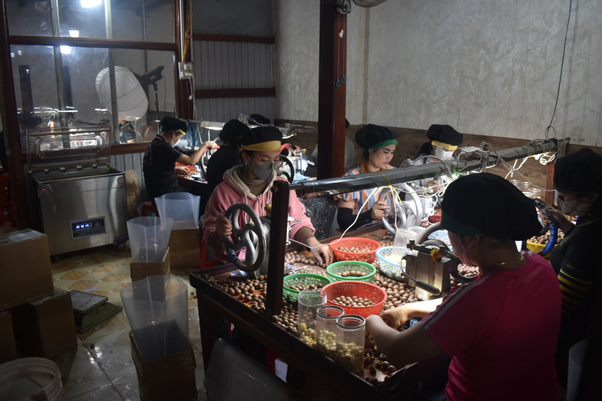 | Công nhân phân loại tách vỏ hạt mắc ca trước khi đóng gói. |