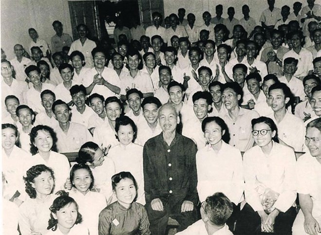 | Chủ tịch Hồ Chí Minh và các đại biểu tại Đại hội lần thứ III, Hội nhà báo Việt Nam tháng 9.1962. Ảnh tư liệu. |