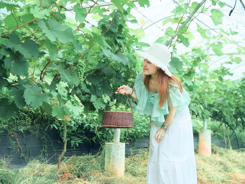 | Hiện ngoài bán cho các thương lái, vườn nho của gia đình anh thu hút được nhiều đoàn khánh du lịch đến tham quan, học tập kinh nghiệm, trải nghiệm hái nho và mua sản phẩm tại vườn./. |