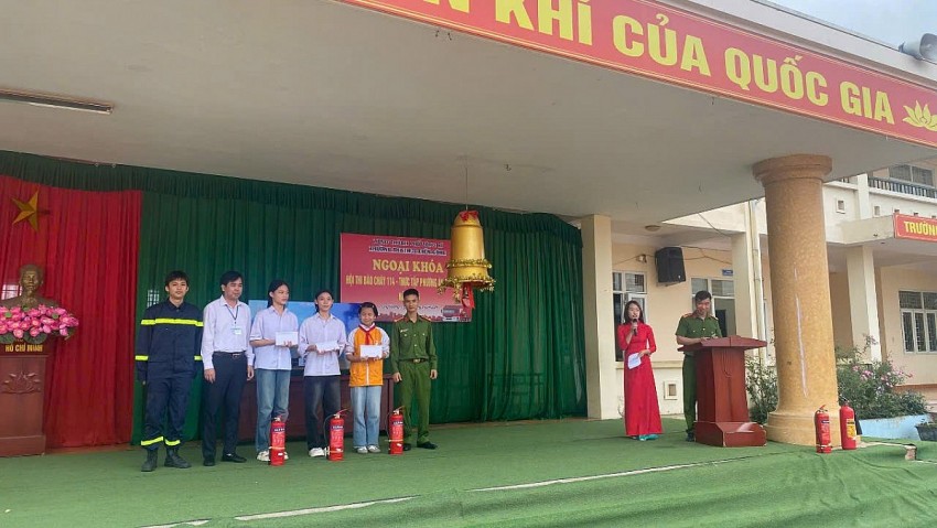 | Ban tổ chức trao giải và bình chữa cháy cho học sinh đạt giải Hội thi. |