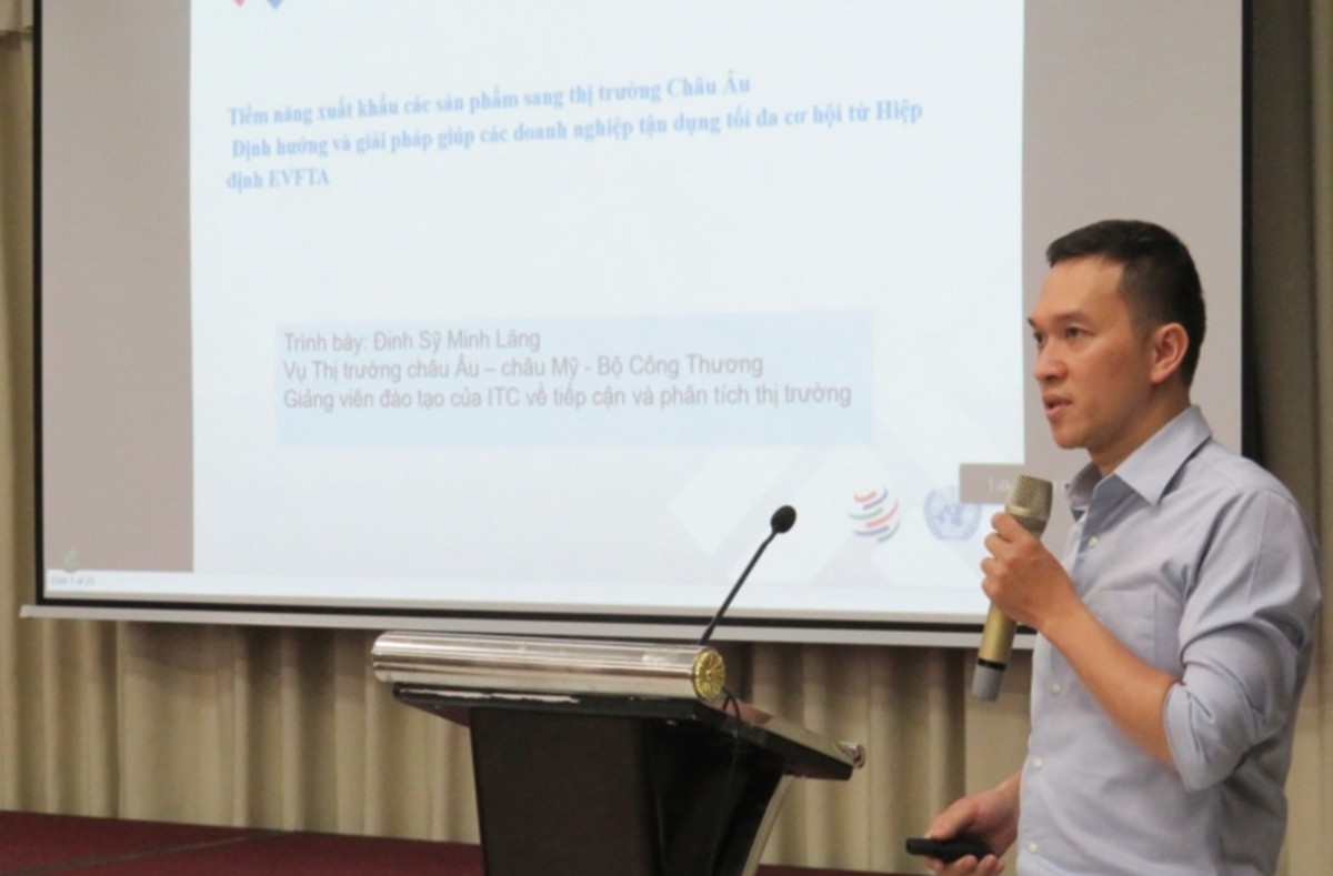 | Ông Đinh Sỹ Minh Lăng, Vụ Thị trường châu Âu-châu Mỹ (Bộ Công Thương) phát biểu tại hội thảo. |